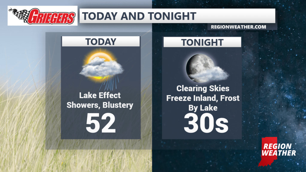 Happy Friday! Our cooler air will stick with us today and has helped to kick off lake effect showers that will gradually shift from west to east by afternoon. Blustery and cool today with highs in the low 50s at best. Tonight we’ll clear those skies out which is a recipe for a COLD night. Temps will drop well into the 30s. Frost is likely in and around the lakeshore with a Freeze possible as you head inland–if you plan on holding on to any of those sensitive outdoor plants, you’ll need to cover them up or bring them in. Sunshine returns for the weekend with rebounding temps in the upper 50s Saturday and mid 60s Sunday!