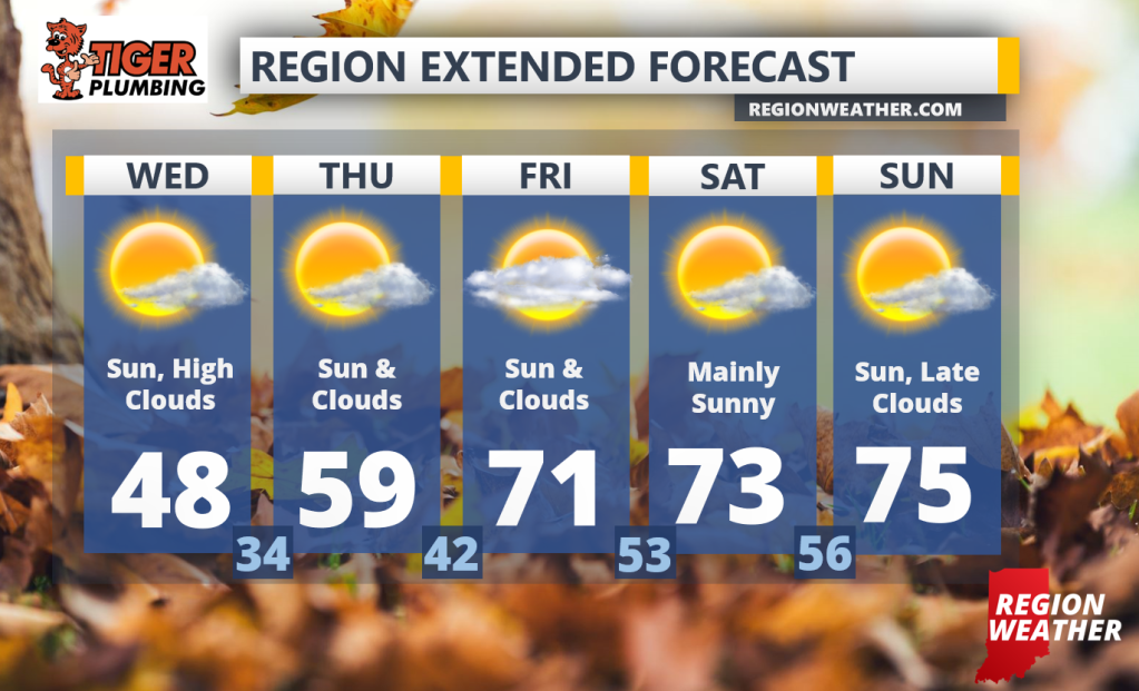 What a great weekend we have in front of us–pumpkin patches will be PACKED. High pressure will be in control of our forecast through the weekend and as it slides off to the east we’ll funnel in warm, Gulf of Mexico air. Gone will be the 30s/40s and we’ll replace them with 70s through the weekend! Intervals of clouds will float across our mainly sunny sky over the next few days.