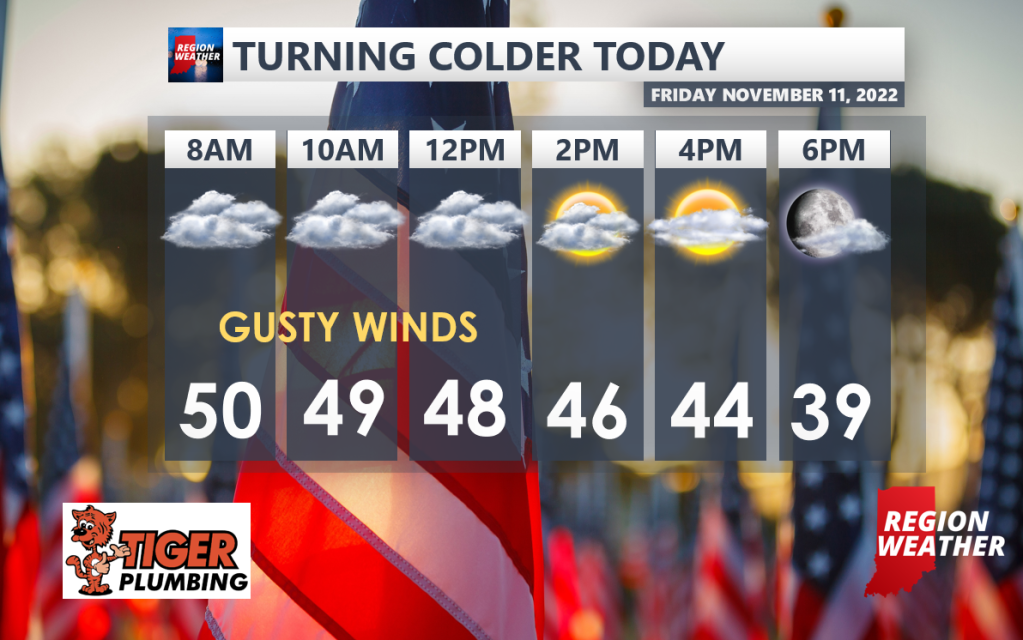 Happy Friday! You made it! The cold front is through this morning and that gusty northwest wind will continue to usher in colder air today–temps will slowly slide back through the 40s with skies eventually clearing out. Expect clouds to increase once again tonight as the lake effect machine begins to organize with scattered lake effect snow expected on Saturday, especially in LaPorte County east towards South Bend and north into Michigan.