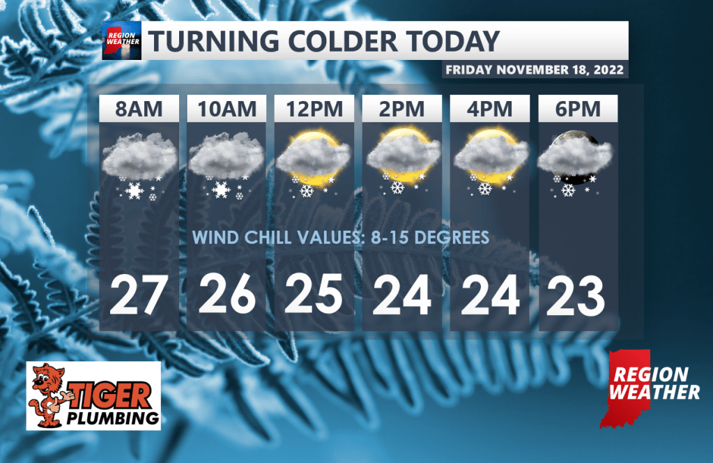 Another reinforcing shot of colder air is moving through this morning bringing pockets of snow through the Region–untreated surfaces this morning are messy as evident with the numerous slide offs and accidents this morning–please take it slow. Treated roads are doing much better. The snow showers will continue on and off throughout the day, especially as lake effect sets up in northern Porter and La Porte counties. Not looking for anything noteworthy accumulation-wise, but an inch or two in those spots is possible through this afternoon. Everyone turns colder today with temps slowly falling back through the 20s behind this front–it will feel more like the 10s through your Friday evening.