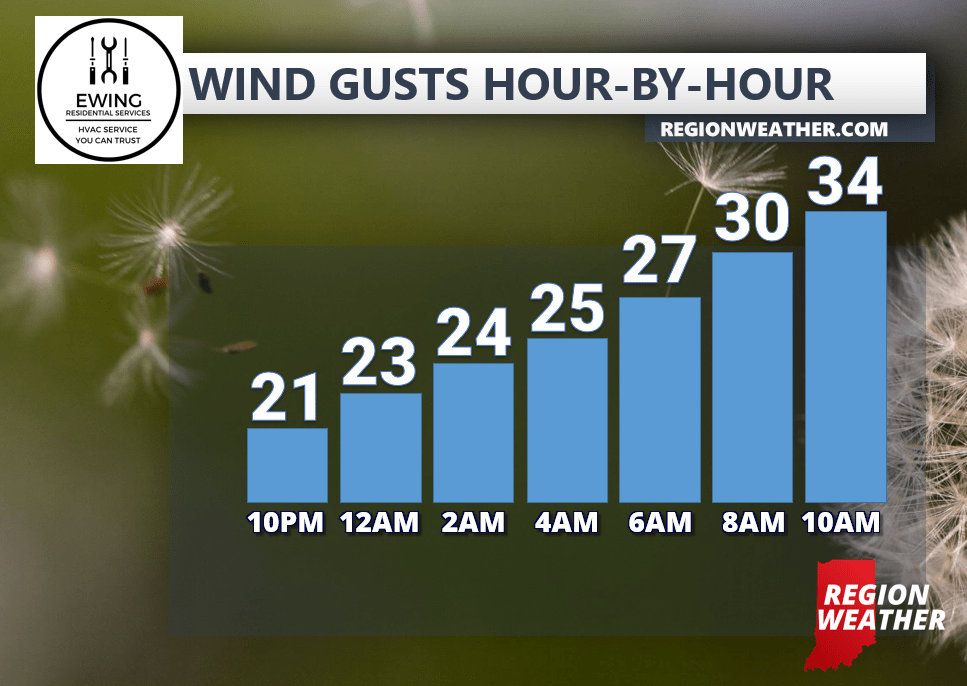 Just when we said goodbye to the wind–well, it’s back. Another wind-maker is on the way and we’ll begin to feel the influence of this system tonight. Our windiest period will be tomorrow (Friday) with gusts over 40 mph possible. It’s not until early Saturday that winds will relax as this low pressure pulls away from NWI.
