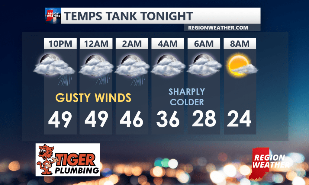 We have a few more hours of this 50 degree air then the bottom will fall out. We’ll be in the 20s tomorrow morning and won’t recover much during the day–but on a positive, we’ll have lots of sunshine! Winds will finally begin to back off later in the day, but that strong wind will be with us over the next 12-18 hours.