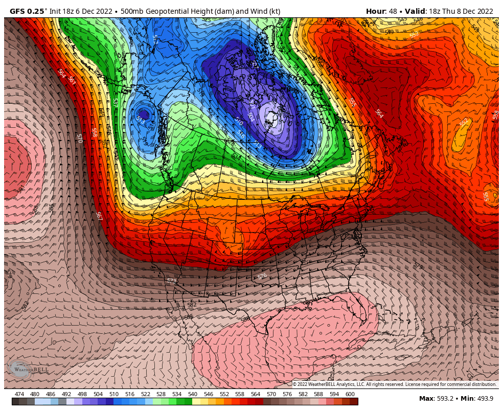 As we talked about in our Sunday evening Region Weather LIVE broadcast, there are signs that this snow and cold come east in the week leading up to Christmas. I mean, it has to at some point right? Take a look at the upper air pattern–anything in yellow and green typically translates as cold enough for snow here at the surface: