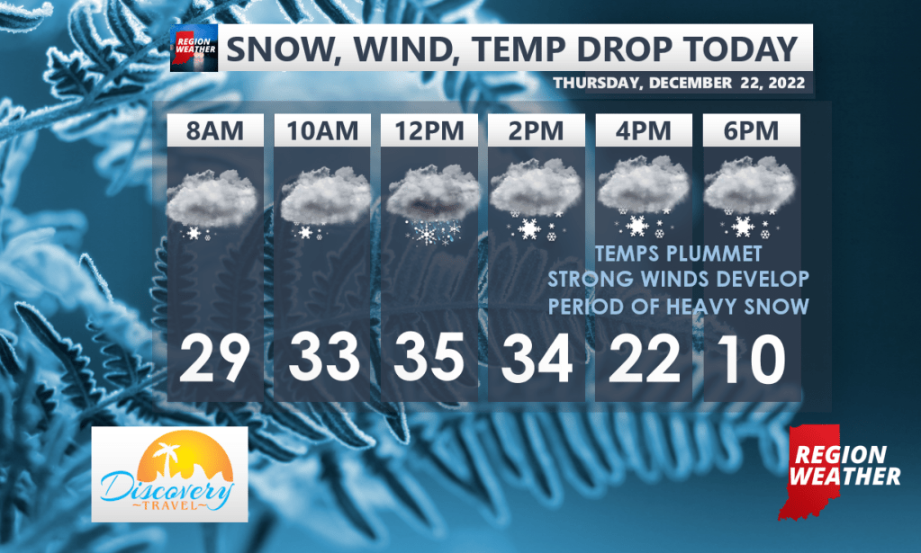 1. Temps Plummet | Temps will go from 35 to 0 in the matter of hours with wind chills in the -25 to -35 degree range by late tonight. Incredible cold with this storm system! Everything will turn to ice by late afternoon.