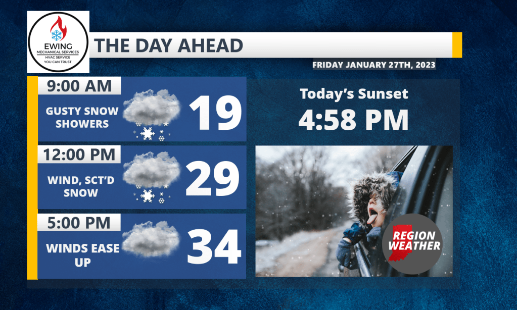 Happy Friday! Our first Alberta Clipper of the year will roll through today bringing gusty winds and some bursts of snow. We typically don’t see a lot of snow from these, but the wind/snow combo can be temporarily tricky! We’re expecting some snow to move in this morning and linger for several hours with gusty winds expected for much of our day. Temps are bone-chilling cold this morning (near 10) but will rapidly “warm” into the 30s by early afternoon on these gusty southwest winds.