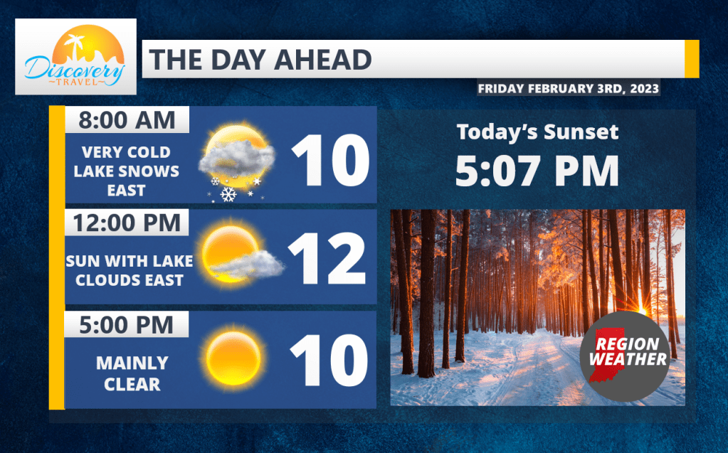 Scattered lake snows, mainly out towards LaPorte County will continue for the first portion of today before winding down, otherwise we’ll break out into some sunshine with temps staying steady near 10 all day. We’ll quickly bounce back this weekend with highs well into the 30s tomorrow and nearing 40 Sunday so…this won’t last long much like cold snaps have gone this winter so far. Happy Friday!