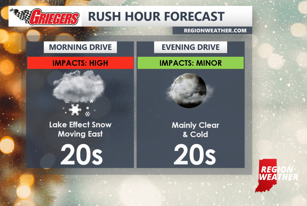 Our band of moderate to heavy lake effect snow will advance east before winding down quickly this morning. It centered over Lake County last night and is now pushing through Porter County as it makes its way into LaPorte County shortly (7am right now). Outside of this morning band of snow, we’ll have a quiet, but blustery and cold day with sunshine returning! Highs will struggle to do much of anything today as they remain steady in the mid to upper 20s.
