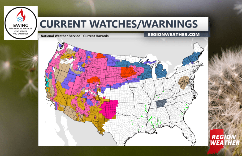 We’ve been talking about this storm system for the last 2 weeks and it’s finally aboard the western US and is packing a punch! Take a look at the real estate of Winter Storm Watches (blue), Winter Storm Warnings (pink) and even Blizzard Warnings (red). Everything else you see out west is for the wind which is really impressive with this system!