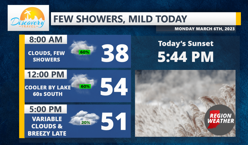 Good Monday morning everyone! Passing showers can be expected today as a cold front makes its way through this afternoon. Temps will likely reach into the low 60s for our Newton and Jasper County folks while temps hold in the 50s in our northern counties. We all cool down back into the 30s today as we lose any shower chances. This will set the stage for a cooler, but seasonable week ahead of us as we watch our next bigger storm system arrive late week into the weekend!
