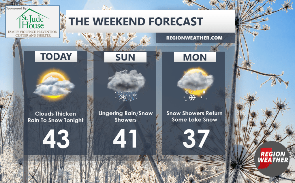 Our next system approaches this evening bringing some rain that will quickly change over to more wet snow. Snow showers will linger Sunday on and off and will likely mix with some rain at times during the day. Not looking for any big totals out of this one either with a half inch to a little over an inch of snow expected. We turn colder Monday with a trough of low pressure that will swing through the Region kicking off some snow showers that eventually lead to some lake effect snow showers. We may get slightly higher totals out of that event–we’ll discuss on our Sunday evening edition of Region Weather LIVE! Enjoy the weekend everyone!