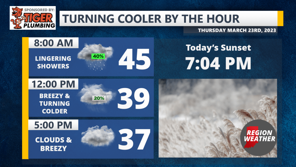 Our cold front is through the Region and the wind has shifted to the north–a sign of colder air moving in. Temps are in the mid 40s this morning but will scale back into the 30s throughout the day on that gusty north wind. We’ll have lingering rain around through midday before drier air should push the rain just to our south where it will stay overnight as a steady stream of rain and more storms affect areas downstate. Our quiet weather will continue tonight into Friday before all this moisture comes back at us with a strong low pressure Friday night into Saturday!