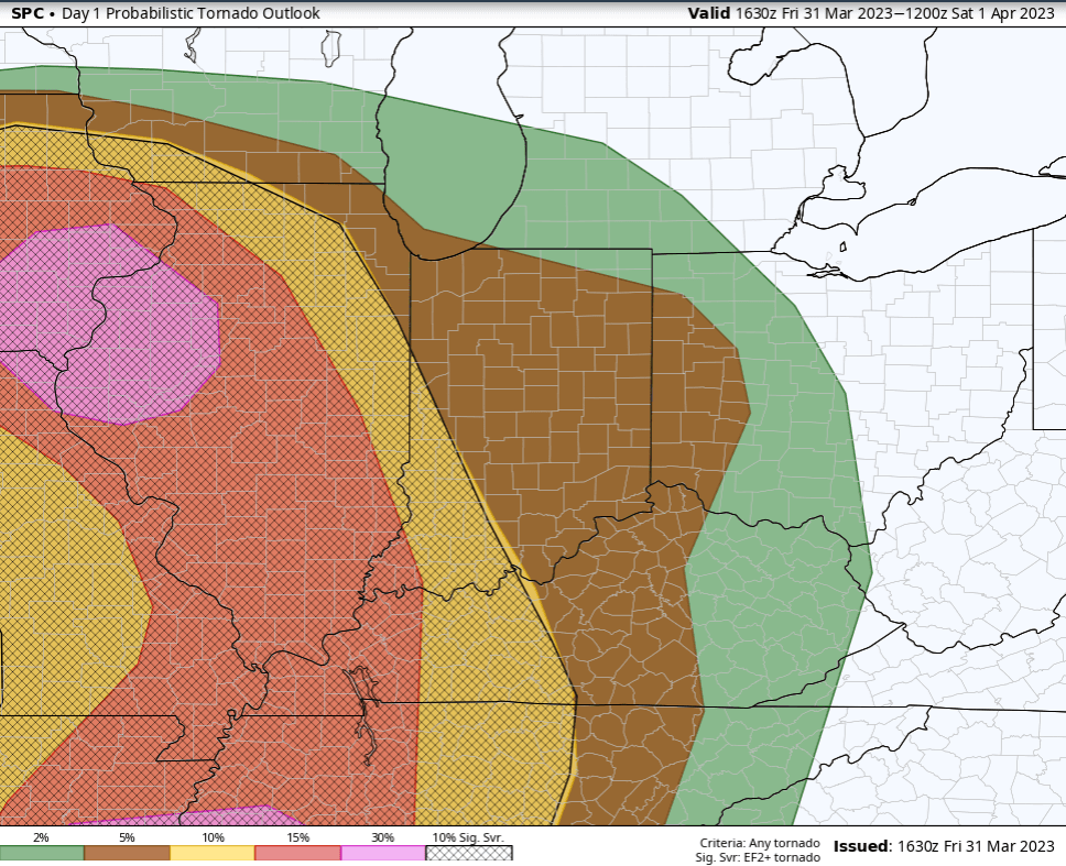 This will be a dangerous afternoon ahead of those folks. The map immediately below shows the tornado risk–notice how it drops off as you get closer to the Region but there’s still a risk. This continues to be in line with our earlier forecasts–so nothing has changed but visually this is what the threat level looks like going into the afternoon and evening.