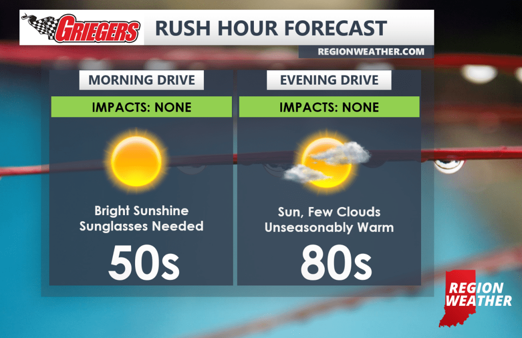 We’ll be pushing record highs today with the record at Valpo sitting at 81 degrees. Lots of sunshine can be expected as we make a run into the low 80s this afternoon–it’ll be breezy again and with the dry air, our fire risk is high so keep those open flames away from the great outdoors.