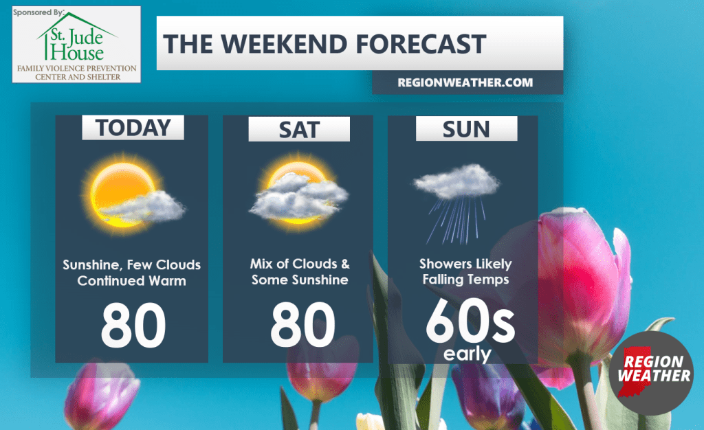 Unseasonably warm temps continue to start our weekend with more clouds mixing in over the next two days. Showers and storms will arrive Saturday night with a cold front that will bring lingering rain to the Region on Sunday. Temps Sunday will drop from the 60s early into the 50s and eventually 40s later in the day. Saturday is your day to get your outside activities in!