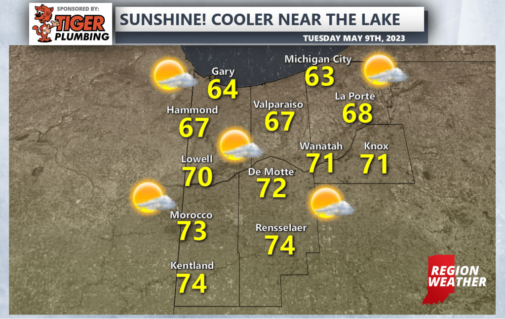 Happy Tuesday! We’re entering a stretch of beautiful weather that will take us through Thursday with lots of sunshine! You’ll notice a cool breeze out of the north today that will cause a noticeable difference in temps near the lake today–otherwise we’re into the 70s inland. Enjoy!