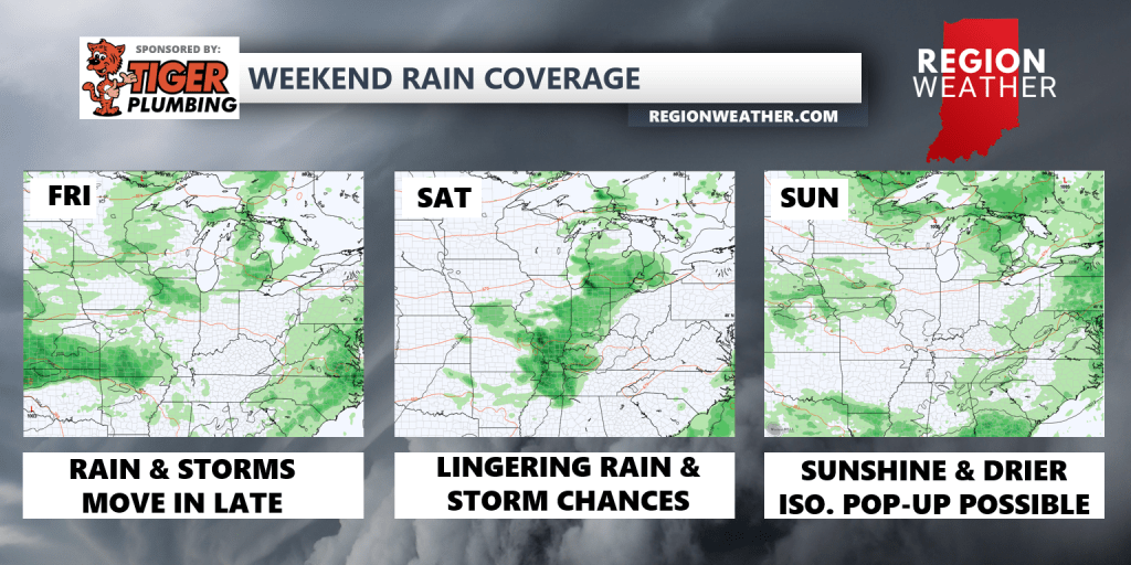 Happy Friday NWI! You have plans and we have rain chances–let’s put some timing on it. Our most widespread shower and storm activity looks to move in later today into tonight as a wave of low pressure zips through the Region. We’ll have some lingering rain around Saturday before we clear things out on Sunday. Our thick humidity will be around today into Saturday before drier, more comfortable air moves in to end the weekend. Pick of the weekend? Sunday. But Saturday won’t be a complete washout by any means as the bulk of the rain and storms should begin exiting the Region. We’ll be around for updates all weekend as needed!