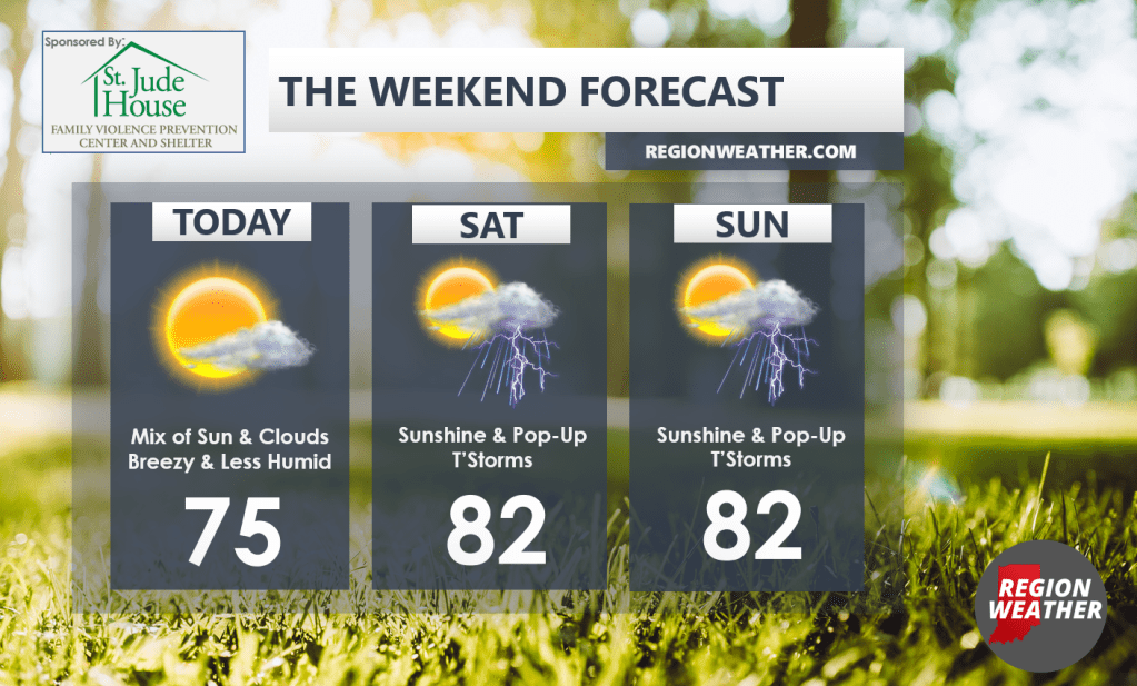 It is downright refreshing today! Sun mixed with clouds and lower humidity is the name of the game as highs only push into the mid 70s. If you’re heading to the beach today you’ll want to stay out of the water–4 to 6 footers and a high risk of rip currents can be expected with this north wind. Also a big night for the Porter County Fair–perfect weather for you if you’re heading there. Temps will scale back into the 60s this evening.