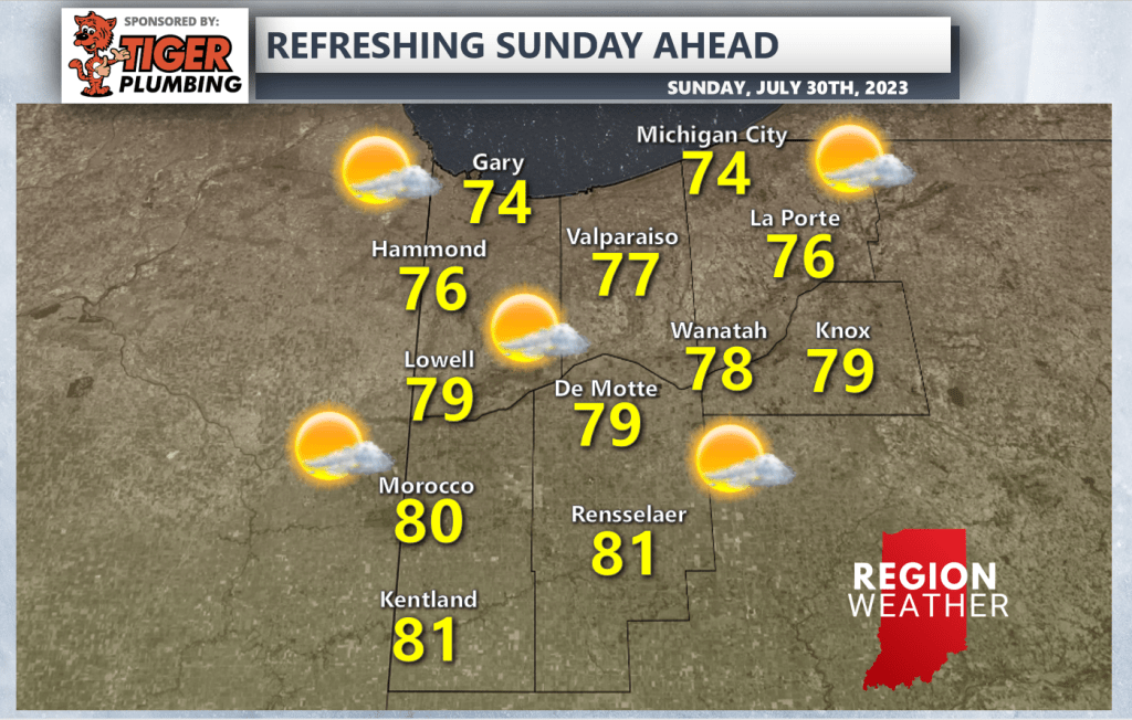 Good Sunday morning everyone! What a day we have in front of us. It’s still a tad humid this morning, but that humidity will begin to fall hour-by-hour today with a noticeably comfortable airmass around us later today into this evening. Temps with a north breeze will feel delightful with highs only in the upper 70s for most. It’ll be a bit cooler near the lake with mid 70s expected along our shoreline. Enjoy!