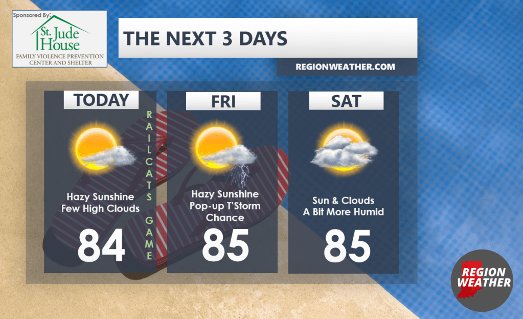 Happy Thursday everyone! Don’t forget it’s “See You in the Seats” Night at the RailCats game tonight with fireworks and special jerseys with proceeds going to our non-profit St. Jude House. Weather looks GREAT for the game (more info in our next post). We’ll remain “summery” through Saturday with a chance for a pop-up storm or two Friday as a boundary sinks across the lake. Otherwise manageably humid conditions and highs in the mid 80s can be expected!