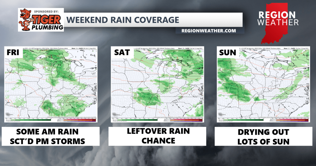 Happy Friday NWI! You have plans and we don’t need rain and storm chances getting in the way of those this weekend–here’s what to expect. A morning line of rain will work through the Region today before we clear out a bit. Storms may refire later today ahead of a frontal boundary so be weather-aware for any Friday evening plans you have. (we’ll be on it!) Saturday will feature leftover rain before the front clears and we bring in drier air late Saturday into Sunday. We’ll chat about all this and beyond in a special Region Weather LIVE broadcast this evening!
