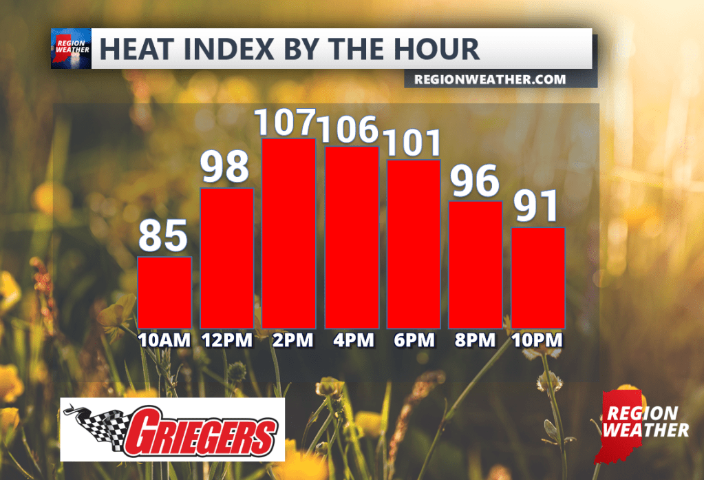 Temps will be into the low to mid 90s today. Yes, that’s hot. The real issue will be the surge of incredibly thick tropical air that moves in today with dewpoints expected to rise to near 80 degrees at times this afternoon. The combination of the high temps and dewpoints will produce heat indices into the 105-115 range today with highest readings in our western counties. Please take care of yourself and others today. Here’s a snapshot of our forecasted average heat index by the hour today across the Region:
