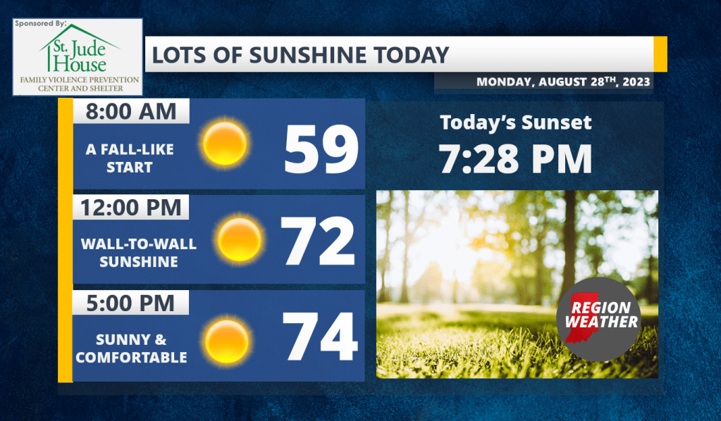 High pressure is large and in charge on this Monday morning doing the thing that high pressures do: provide sinking air and mainly clear skies. It also helped provide a little Fall Preview this morning with lows in the low 50s and even upper 40s for some of you! Lots of sunshine can be expected today with highs making it into the low to mid 70s with a light breezy and comfortable humidity. Enjoy NWI!
