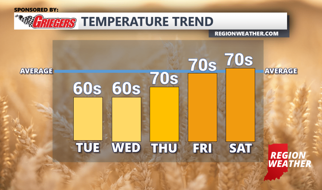 Happy Tuesday to you! Our cold front is through and we’ll be dealing with lake effect showers from time to time today as a cool north wind takes hold of our immediate forecast. Temps will reach the mid 60s today at best today and tomorrow before rebounding closer to average for the end of the week! Find that fall sweater–quick!