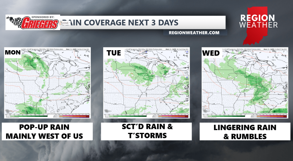 Good Monday morning NWI! We have a swirling area of low pressure to our northwest that will slowly spin its way in here tonight into our Tuesday and Wednesday resulting in an increase in rain and storm chances through mid-week. Most of the rain will pop to our west later today, but we still can’t rule out a few pop-ups locally later today. Our better chance at rain and scattered heavy downpours will arrive Tuesday and Wednesday before we begin to clear this system out late week setting us up for another stellar weekend!