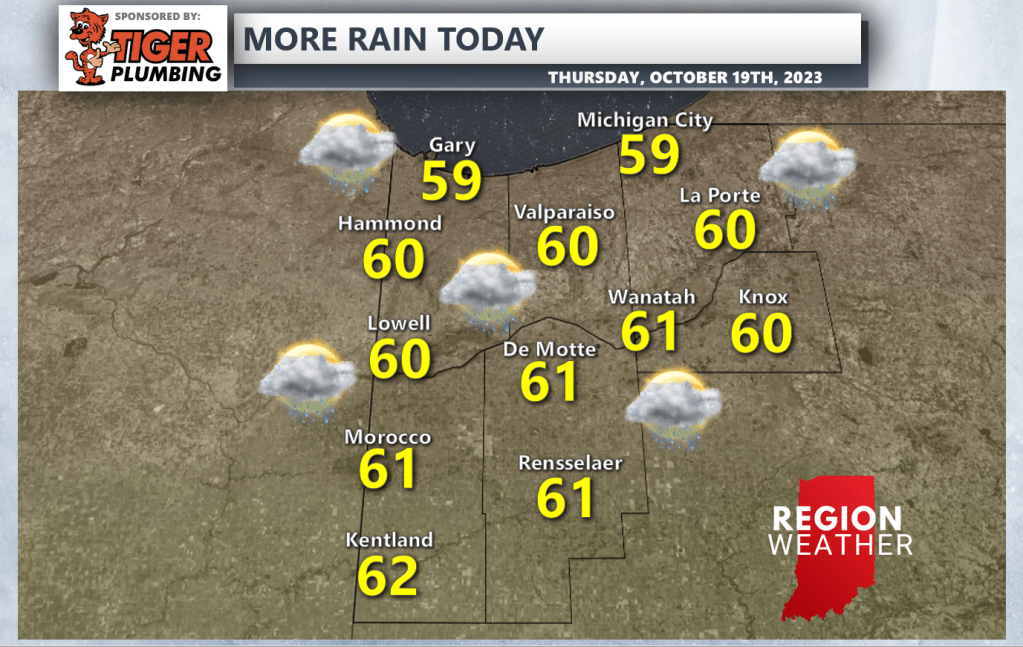 Happy Thursday! Our storm system continues to move through the Region and we’ll still be on the mild side of things today as the cooler air doesn’t arrive until this weekend with a secondary front. The result? Highs pushing 60 today with more rain and showers around. Have a great day everyone–we’re almost to that weekend!