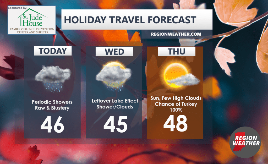 As we get ready to travel and enjoy a wonderful Thanksgiving with friends and family–the weather is the last thing we want to get in the way. The good news is that it won’t this year as improving conditions are expected as we lead up to Thanksgiving itself! Expect on and off rain today with a brisk wind really making it feel quite unpleasant with temps in the 40s. We’ll have lingering clouds and a few lake showers tomorrow before sun peeks begin to win out later in the day. Highs will once again be stuck in the mid 40s. Sunshine with high clouds can be expected for Thanksgiving with highs in the mid to upper 40s in the Region! Chance of turkey and stuffing (or dressing depending on what you call it is 90-100% depending on your cooking skills)