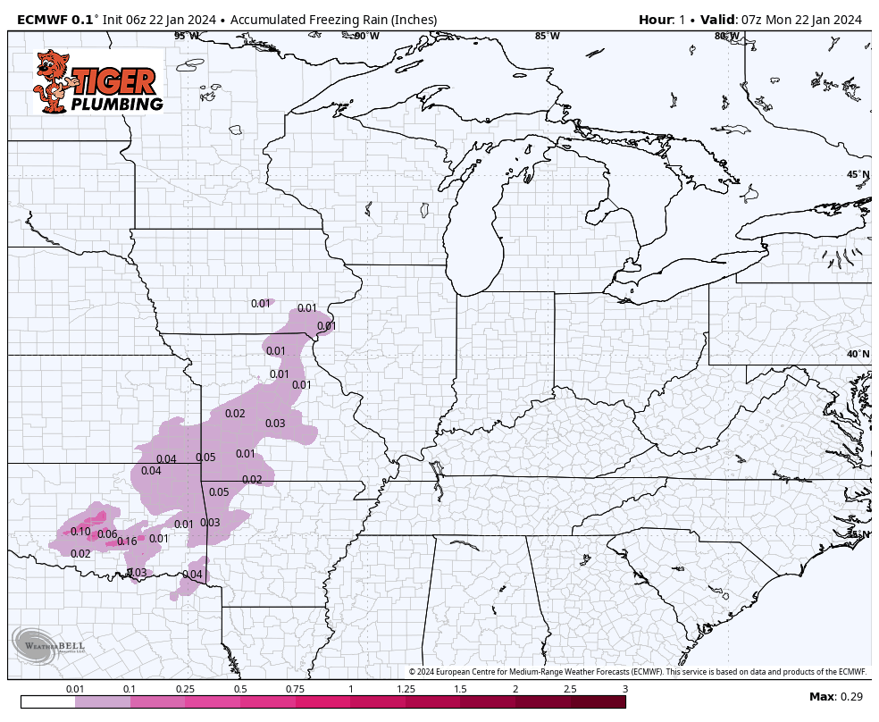 A more significant wave of precip moves in later today into tonight and that’s when we’ll be dealing with a steady period of freezing rain that lingers through the day Tuesday. Temps will be hovering either at 31, 32, or 33 degrees for much of the morning Tuesday, so some of us will have rain, while others have freezing rain–either way, plan on an icy overnight and morning commute. Treated surfaces will be just fine, but another untreated will be problematic. We’ll flip over to mainly rain during the day as temps warm just above the freezing mark–slick travel is still possible through the day with any residual ice.