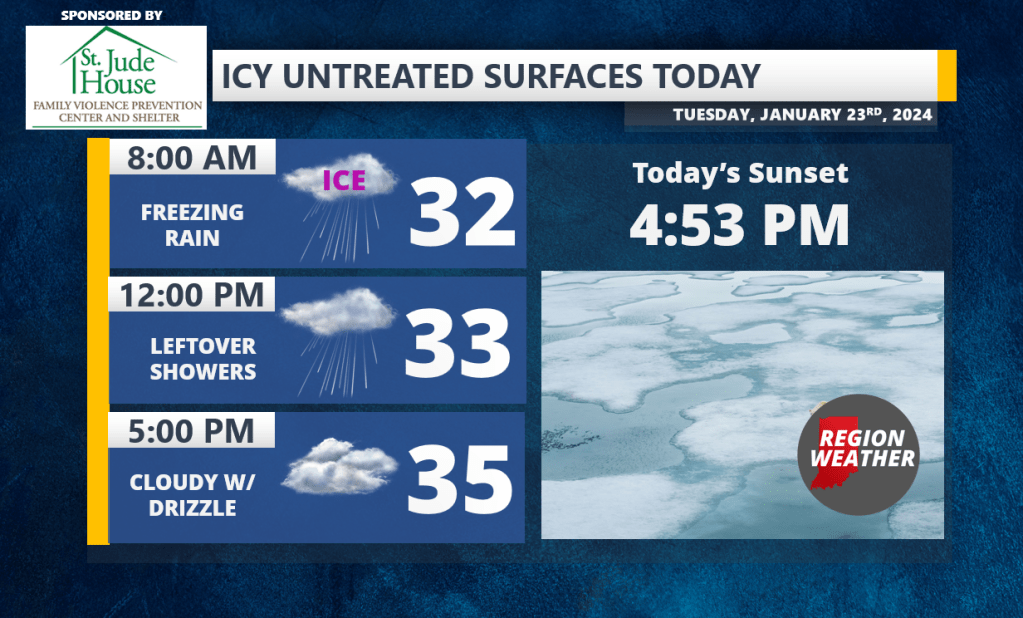 Good Tuesday morning everyone! Rule of thumb this morning–if the surface is treated, it’s just fine. Secondary roads, driveways, parking lots, etc are where you’ll encounter the glaze of ice this morning so be careful heading out the door! (literally). Temps will slowly warm to above freezing by late morning into the midday hours with freezing rain and rain gradually coming to an end this afternoon.