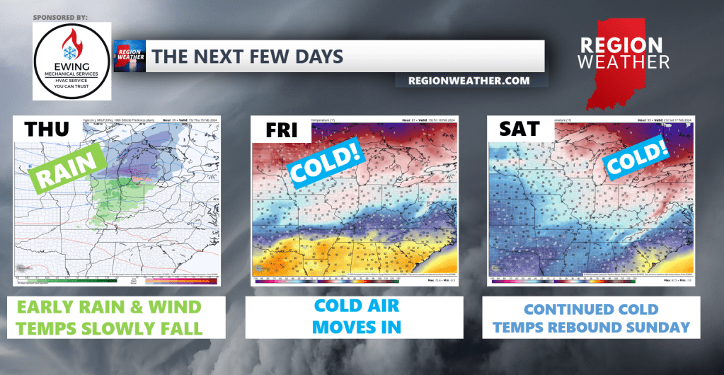 After a Valentine’s Day delight with sunshine, highs in the 40s, and late day clouds, we’ll usher in our next storm system tonight into Thursday. Expect a quick hit of some rain and wind (with heavy wet snow not far from here). Temps will slowly fall back from their start in the 40s on Thursday. Colder air sets in Friday and Saturday with sunshine returning to the Region!