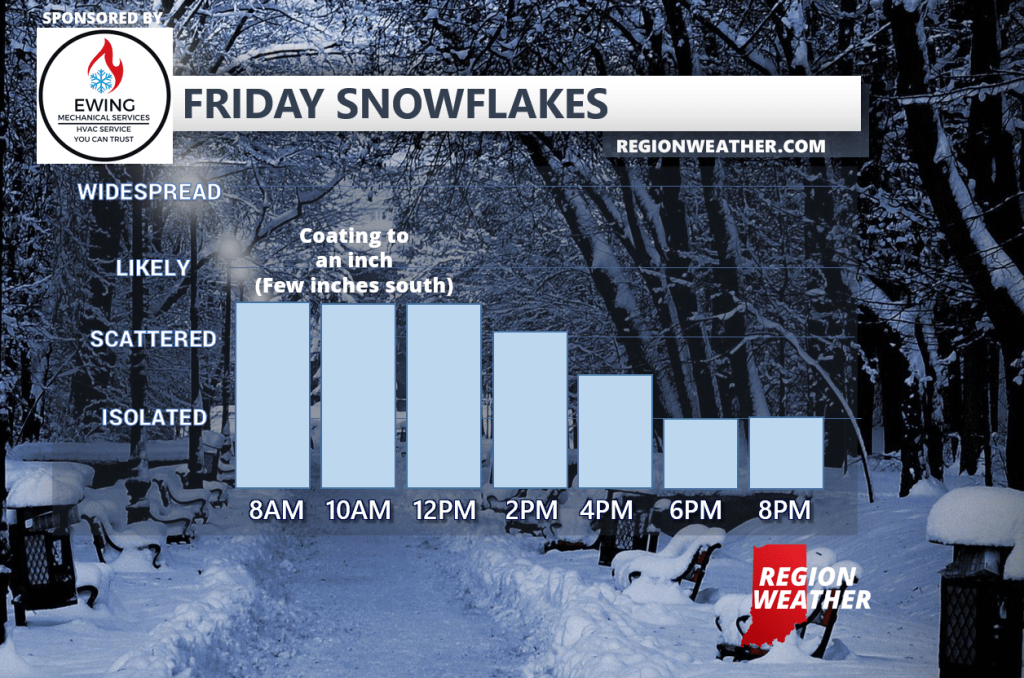 Good Friday morning everyone! A storm system will slide through central and southern Indiana today bringing several hours of snow. The big message with today’s snow is–the further south you are located, the more snow you’ll get. We’re not talking a lot, but a few inches are possible from Newton and Jasper counties south towards Indianapolis–so keep this in mind if you have travel plans down I-65 today, we’ll get a bit slick. The other story is the cold, we’ll stay in the upper 20s to near 30 today, drop back into the low to mid 10s tonight, and will be stuck in the 20s for our Saturday. Combined with a strong wind that develops Saturday afternoon, we’ll be feeling like the 10s to the 10s below zero for much of the next 60 hours.