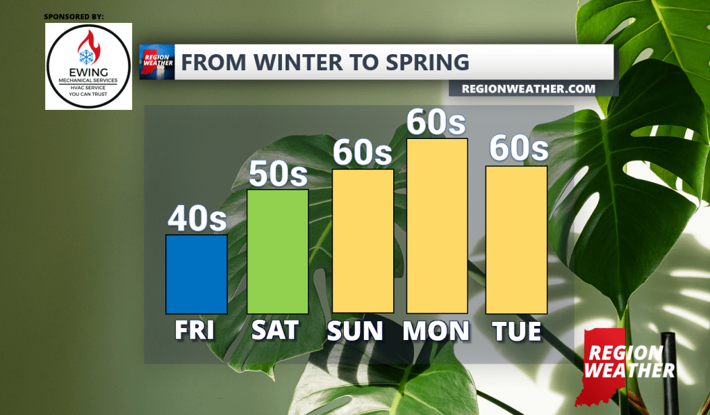 The good old saying in the Region (and anywhere in the US) is that if you don’t like the weather one minute, just wait (time varies) and it’ll change. For us it’s on the timescale of a few days, but we will be firmly in the middle of a spring-like pattern next week! Just have to get through the chilly air today and tomorrow…