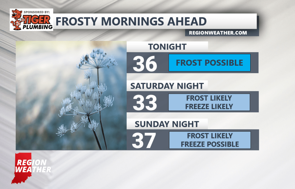 Happy Friday everyone! We have some chilly air settling in for the weekend and that will be especially true at night. Tonight’s frost risk is low due to elevated wind speeds overnight–but there’s a chance some spots could see some frost if winds back off. Our best chance arrives Saturday night into Sunday and then again Sunday night into Monday as winds ease and high pressure sinks in. Our typically colder spots may dip below freezing for a few hours while a frost is likely everywhere else. Take care of those plants that are sensitive to the cold!