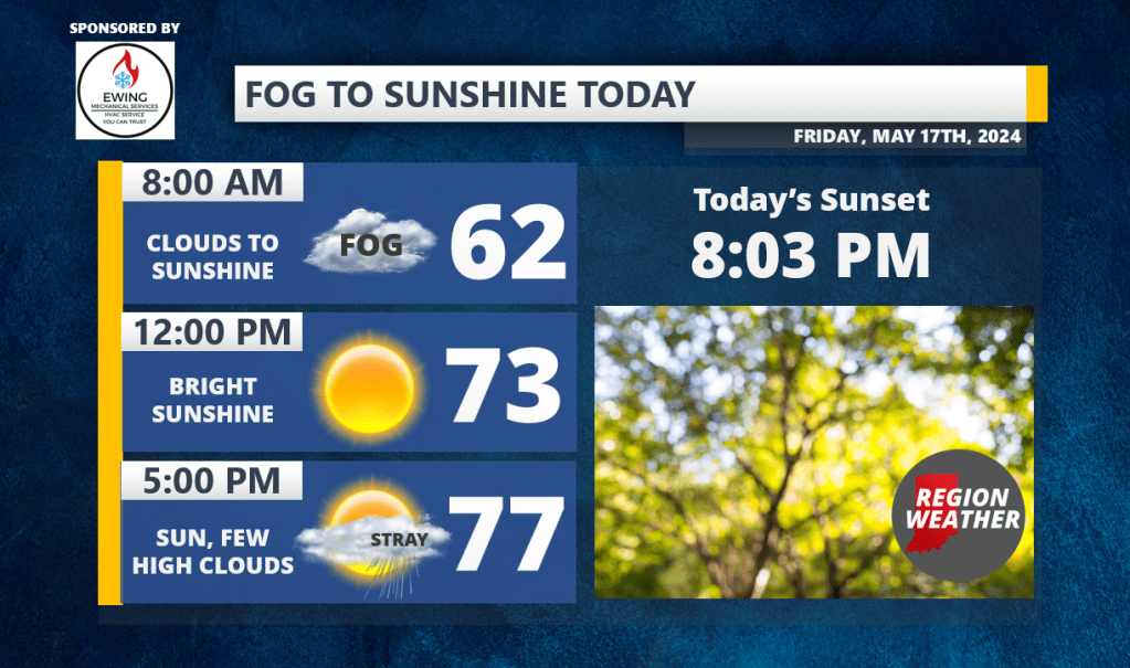 Good Friday morning everyone! You made it! Morning fog and low clouds will clear quickly and give way to lots of sunshine today with highs pushing into the upper 70s. We can’t rule out a rogue downpour developing along a lake breeze today or tomorrow but the majority of hours will be dry and cloud-free. Enjoy the day ahead! We earned it!