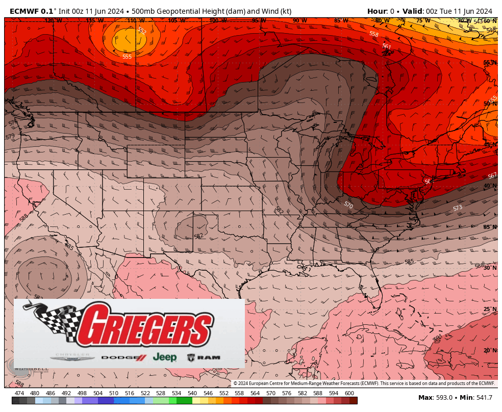 Good Tuesday morning! Another cool, crisp start today, but enjoy it while it lasts. A large dome of heat out in the desert southwest will eventually push our way as a trough builds in the northwestern US. This will push some heat our way with the first taste of warmth on Wednesday and Thursday with highs in the upper 80s to low 90s. We’ll back temps off a bit Friday into Saturday before the ridge really builds over the eastern US. Temps well into the 90s are possible from Father’s Day into the beginning of next week and that will come with tropical humidity as well.