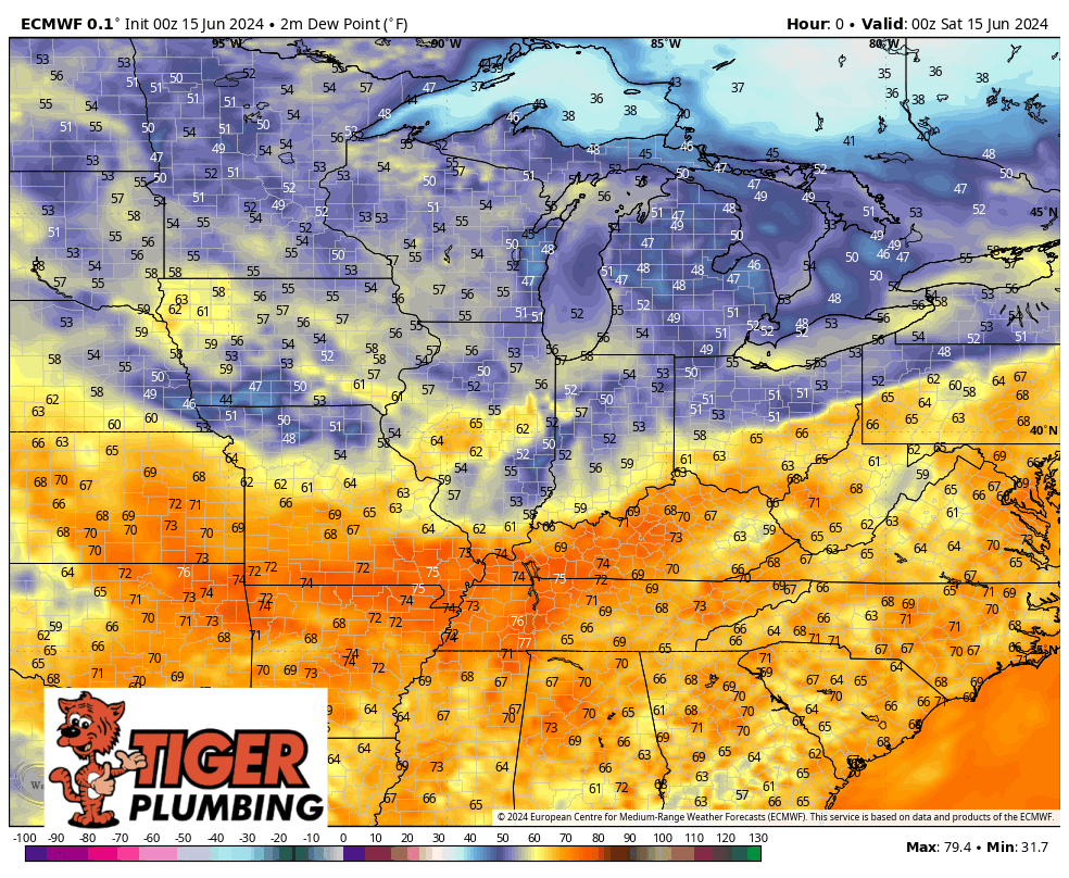 We know we have some heat on the way beginning tomorrow and lasting through much of next week–but we also have that summer-time humidity making a return to the Region as well. Take a look at the nice, comfortable, dry airmass we have in place now as denoted by the blue shaded areas (dews in the 40s). Look at the SURGE in humidity coming from the Gulf of Mexico as we start the week as denoted by the orange colors. This high dewpoint air eventually find its way towards us by Monday and sticks around for the entire week with no end in sight.