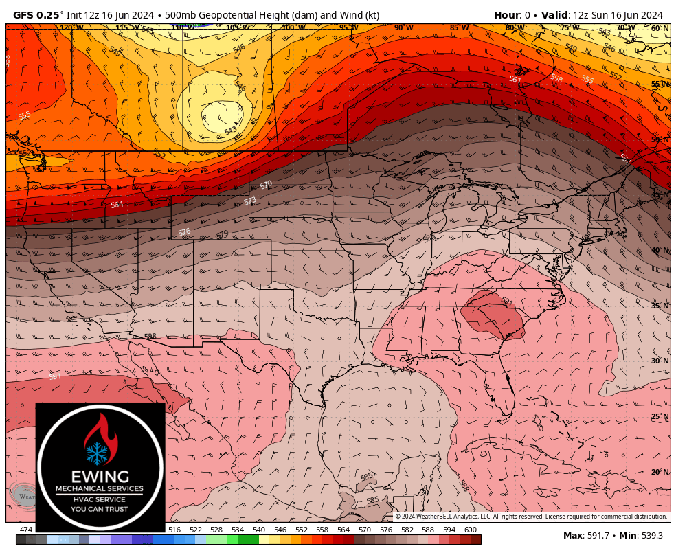 Happy Sunday and happy Father’s Day to all of our Region dads! The heat has arrived and we’re feeling that humidity increase as well. More of this to come over the entire week as a large dome of heat develops and strengthens over the eastern US. You can see that we’ll be on the western periphery of this heat dome meaning yes, it will be hot around here, but the core of the heat will actually be centered to our east. Temps will likely reach into the low to mid 90s each day this week with humidity making it feel like 100+ at times. The main issue this week is the longevity of the heat–with little relief at night those that don’t have AC or a way to cool themselves will have a hard time. Please plan accordingly this week in relation to outdoor activities, hydration, and checking in on the elderly etc.