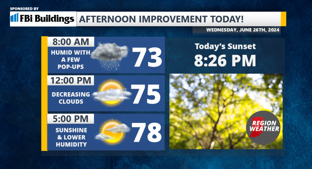 Happy Wednesday everyone! We’re still in the thick humidity this morning, but changes are on the way this afternoon as a cold front moves through bringing in more comfortable air. We could see a few pop-up downpours this morning before this front clears, but we’ll have decreasing clouds and some sunshine once the front is through. Highs today will settle in the upper 70s with a beautiful evening ahead!