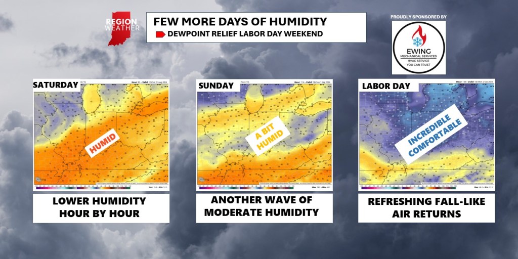 After some good downpours overnight, we’ll have clouds and lingering showers gradually giving way to improving conditions today. The one thing that won’t improve is the humidity which will continue to lay on thick through Friday. A cold front will move through Friday night bringing more comfortable air in here to kick off our Labor Day Weekend. Another front will pass through later Sunday bringing in even drier air. This will set the stage for a fall-like Labor Day to unofficially end summer in the Region!