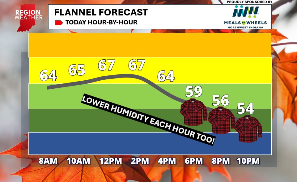 Get ready for a fresh new feel today as a cold front moves east and ushers in more comfortable air each hour today. Temps will turn a bit chilly later this evening into tonight as the drier, cooler air really takes hold. Winds will be gusty today as the drier air pushes in, but should begin to relax later this evening into tonight. Feel free to put that flannel on for dinner and beyond, but don’t forgot to take the tag off.