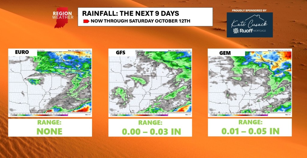 We’re going to spend lots of time getting to know high pressure the next 10 days. The result will be sun-filled days with little in the way of cloud cover other than passing high clouds. We have very slim rain chances tonight into early Friday and then again late Saturday into Saturday night as fronts pass through–but without the connection with the Gulf of Mexico so they won’t have much with them. Take a look at forecasted rainfall totals between now and NEXT Saturday. Amounts vary from nothing to a few raindrops at best.