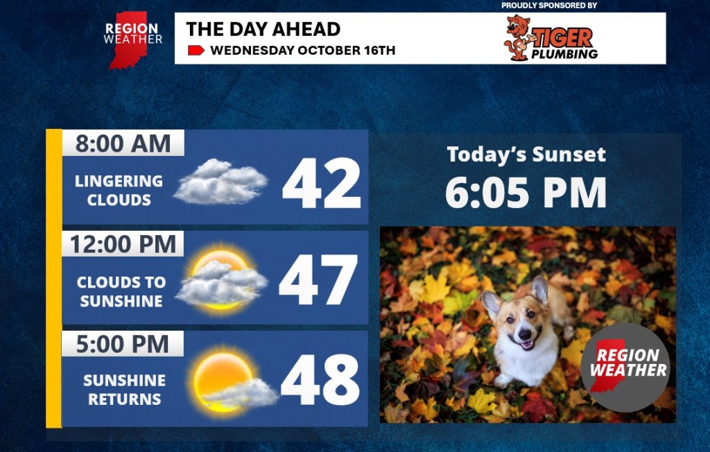 Lingering lake effect clouds will gradually give way to sunshine across the Region today as high pressure builds in. Temps won’t go too far above 50 today as the cool air sticks around. Tonight will be the coldest night of the week with widespread frost and a freeze potential with clear skies and calm winds. We’ll warm from the 30s up into the low 60s on Thursday as our warming trend begins!