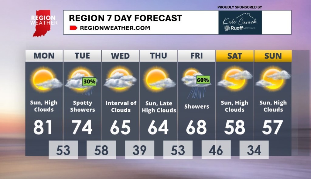 Good Monday morning everyone! If it’s a bit tough getting going this morning, you’re not alone…but the weather should be a motivator today. Just incredible. After a balmy start to the work week, we’ll bring in a cold front with a spotty shower or two Tuesday. Behind the front we’ll turn cooler, but right around average for the middle part of the week. Another front will swing through here Friday with showers before cooler weather takes over for the upcoming weekend!