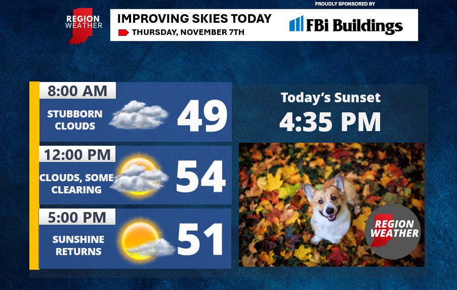 Get ready for another pleasantly cool Fall day today with highs right around average in the mid to upper 50s this afternoon. Stubborn stratus clouds will be tough to clear out, but with a little luck we’ll bring back that sunshine later today. Clear skies tonight will set the stage for chilly temps back into the upper 30s and low 40s. Quiet weather continues into our Friday!