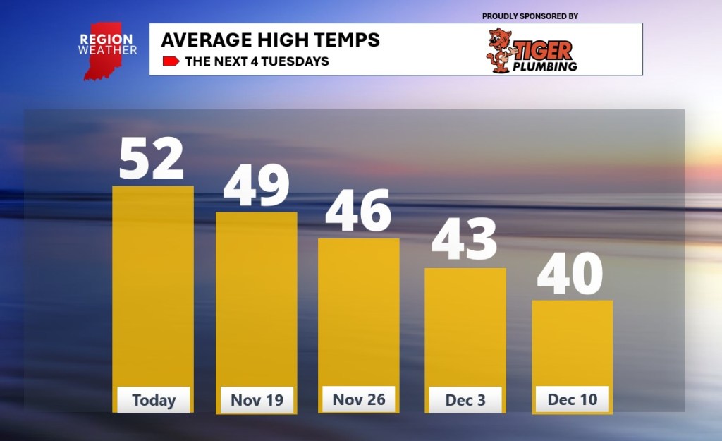 We’re losing about 3 degrees per week in terms of our average high temps–that’s about as dramatic as it gets during the year. As we know from living in the Region, Mother Nature doesn’t always follow suit! We’ll remain at or above average for the majority of the next week before the trend shifts to a colder pattern leading up to Thanksgiving!