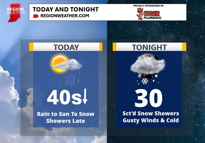 The colder air has arrived behind this morning’s rain. Gusty winds and steady or falling temps can be expected the rest of the day as we go from the 40s into the 30s. Clouds will give way to sunshine which will give way to clouds and a few snow showers later today. Snow showers will be around tonight as well with little to no accumulation overnight. More organized snow moves in tomorrow.