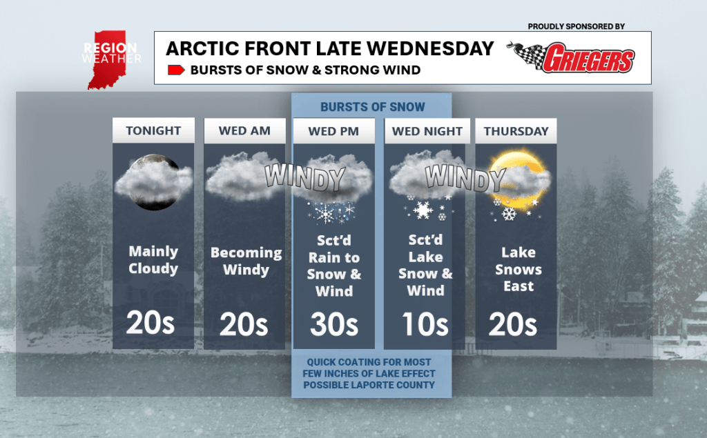 Here’s your heads up as you’re getting ready for your day tomorrow. We have a temp drop, strong winds, and some quick bursts of snow in the forecast as we chatted about on our broadcast Sunday evening. A powerful clipper system will surge through the Great Lakes tomorrow bringing gusty winds and bursts of snow through the Region tomorrow afternoon into the evening. We’ll also have a temp drop from the 30s into the 10s tomorrow evening and overnight. I’m not expecting much snow with this, but a quick coating to an inch is possible with the bursts of snow that accompany the arctic front itself. Tomorrow night into Thursday lake effect snow will be going in LaPorte County into SW lower Michigan and over towards South Bend. Several inches of snow are possible, especially in northeastern LaPorte County by Friday morning.